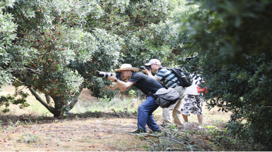 上午9点左右,参加活动的二十多人乘车到达了杨梅基地。走进园林,只见树上挂满了色泽鲜红、晶莹剔透的杨梅,令人垂涎欲滴。看着这些圆润肥硕的乌梅,大家都忍不住伸出手摘一颗,品尝起初夏的第一口杨梅,让丝丝酸甜在口腔里绽放。当然,大家也没忘记另外一个活动内容,就是拍摄记录人们采摘的快乐与满足。因为是周末,杨梅林里还有不少闻讯而来采摘杨梅的市民,他们也成为了会员们相机镜头里的焦点。