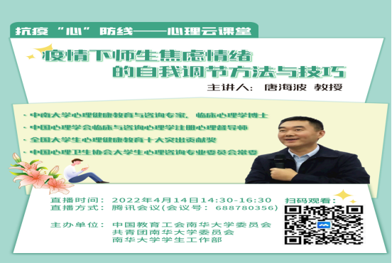 为缓解因疫情、工作、学习、生活等方面带来的消极情绪与压力,关爱教职员工和学生的身心健康,保持身心愉悦、积极向上的健康心态,更好地投入到工作、学习和生活中。4月14日下午,PA集团官网联合校团委、学工部特邀中南大学心理健康教育与心理咨询专家唐海波教授作《疫情下师生焦虑情绪的自我调适方法与技巧》线上心理讲座,为师生送上实用的“心理防疫宝典”。
