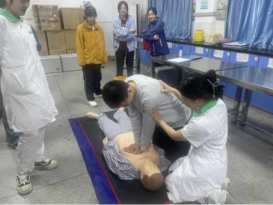 在实操环节,同学们积极参与,对心肺复苏操作进行着实践,指导老师在一旁耐心指导,细致入微地纠正动作。通过实操训练,同学们都能够熟练地完成心肺复苏急救操作。