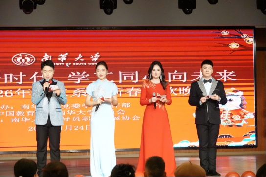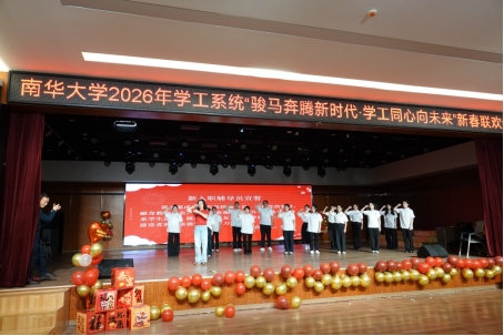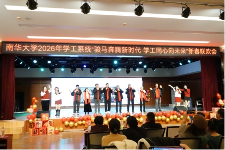 特邀衡阳市政法系统嘉宾与学校五位辅导员联袂呈现T台秀《骏风满袖・锦步迎春》,传统服饰的雅致与现代风尚的灵动交相辉映,步态翩跹间尽显文化交融之美,也展现了学工人多元包容的精神风貌。核科学技术学院辅导员带来朗诵《核光同行》,铿锵有力的语调、饱含深情的告白,诉说着南华学工人深耕核特色育人、坚守育人初心的执着与信仰,传递出奋进向上的磅礴力量;雨母校区十余名辅导员携手演绎舞蹈《导,这边舞!》,明快的节奏、整齐的舞姿,彰显了学工人朝气蓬勃、团结奋进的青春活力,将现场氛围一次次推向小高潮。