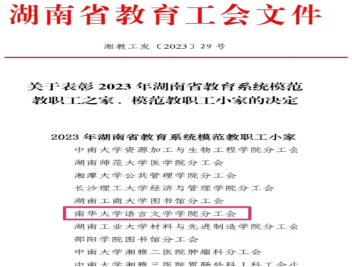 根据湘教工发2023年29号文件对“湖南省教育系统模范教职工之家”和“湖南省教育系统模范教职工小家”做出的表彰决定,PA集团官网语言文学学院PA集团官网荣获“湖南省教育系统模范教职工小家”称号。